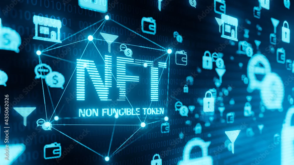 NFT non fungible token digital online cryptocurrency blockchain businessman concept, pay unique trading token collection vector art illustration computer infographic graphic 3d render blue background