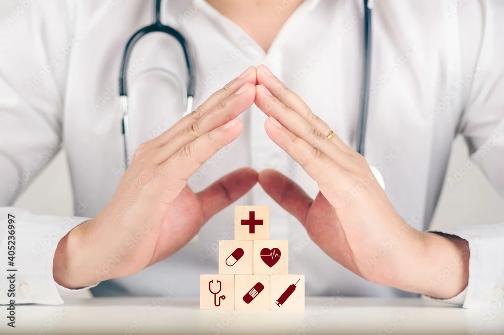 Hand arranging wood block stacking with the healthcare medical icon. Health insurance - health concept