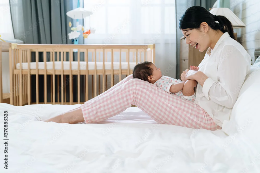 side view of asian new mother talking with joy to her baby who's lying on her legs. chinese mom interacting with her daughter in bed after waking up in ...