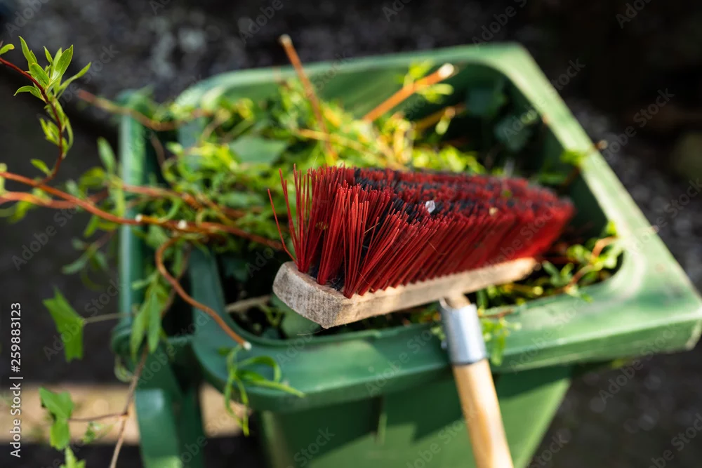 Green wheelie bin / garden waste container and broom filled with fruit and vegetable waste, garden waste, organic waste for composting and fermentation. ...