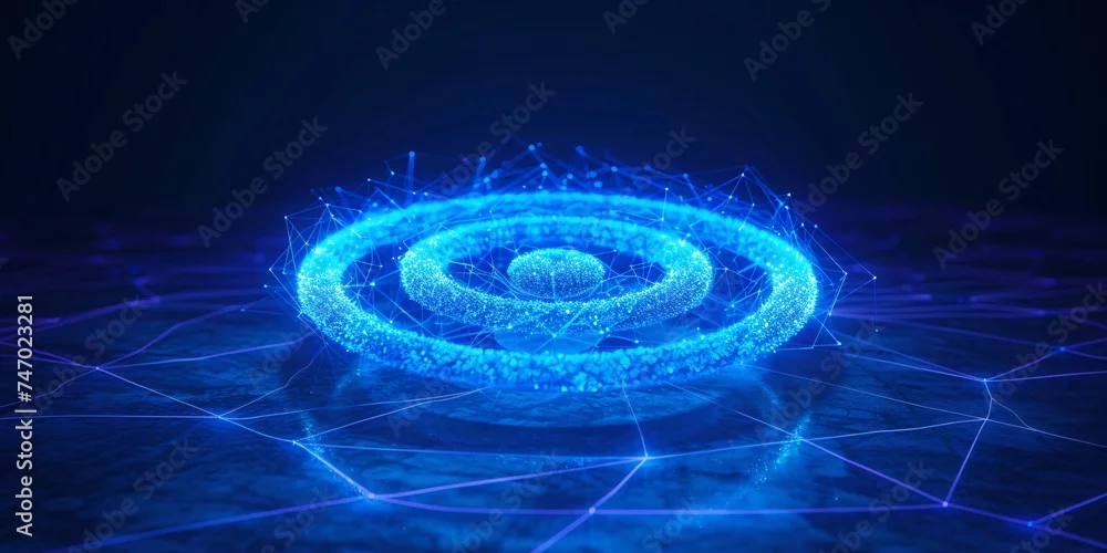 3D wireless light wave with abstract scanning radar sensor and digital symbol for wireless monitoring and protection, featuring a transparent neon circle and blue electric frequency glow.