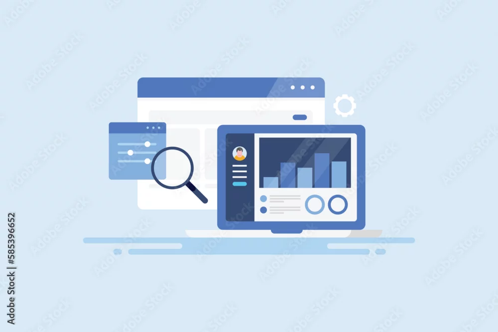 Data and information displaying on web page laptop screen SEO marketing advertising analytics vector illustration concept.