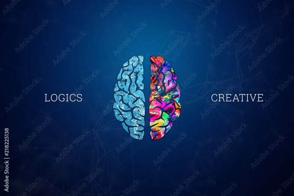 Illustration of a human brain, top view. Different halves of the human brain. The creative half and logical half of the human mind.