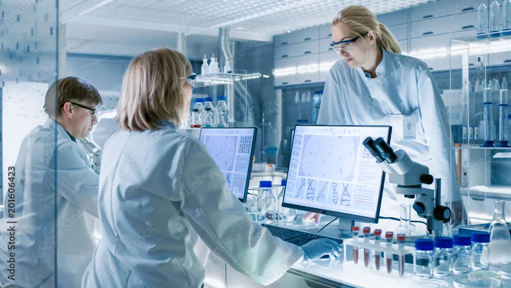 In Modern Laboratory Senior Female Scientist Discusses Work with Young Female Assistant. Laboratory Has Computers, Beakers and Other Technology for High Tech Scientific Analysis.