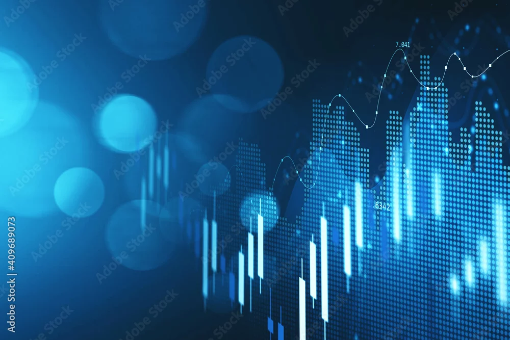 Concept of stock market and fintech forex concept. Blurry blue digital charts over dark blue background. Futuristic financial interface. 3d render illustration.