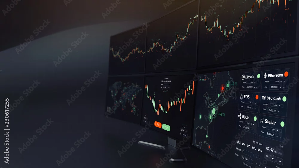 Futuristic stock exchange scene with charts, numbers and world trading map displayed on multi screens (3D illustration)