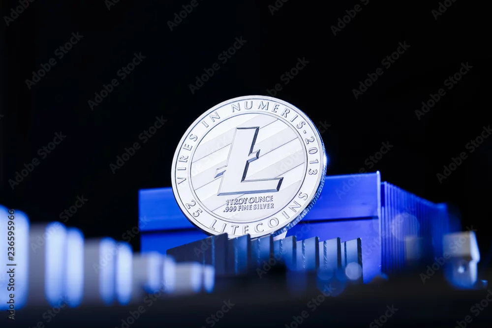 Photo of crypto currency litecoin and processor on blue background