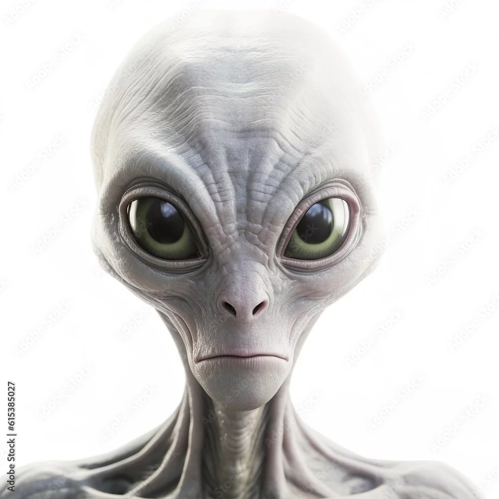 Alien head scary future face portrait realistic generative AI illustration isolated on white background. Future aliens concept