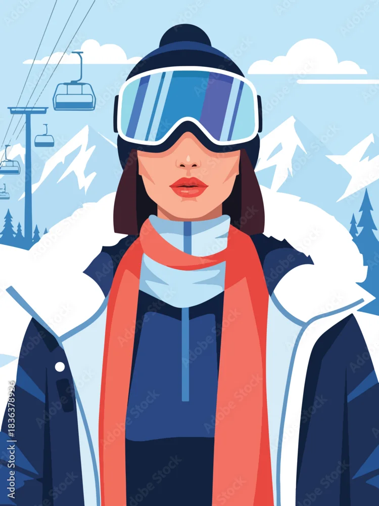 Flat modern illustration of a fashionable woman wearing ski goggles and parka at a snowy mountain resort. Ideal for travel lifestyle, sporty fashion, and outdoor winter themes