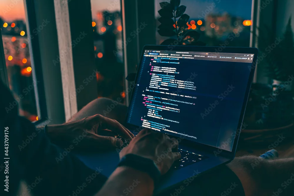 The code is on a laptop on a wooden table in front of the window in the dark with a view of the lights of the night city, color lighting in the room, ...