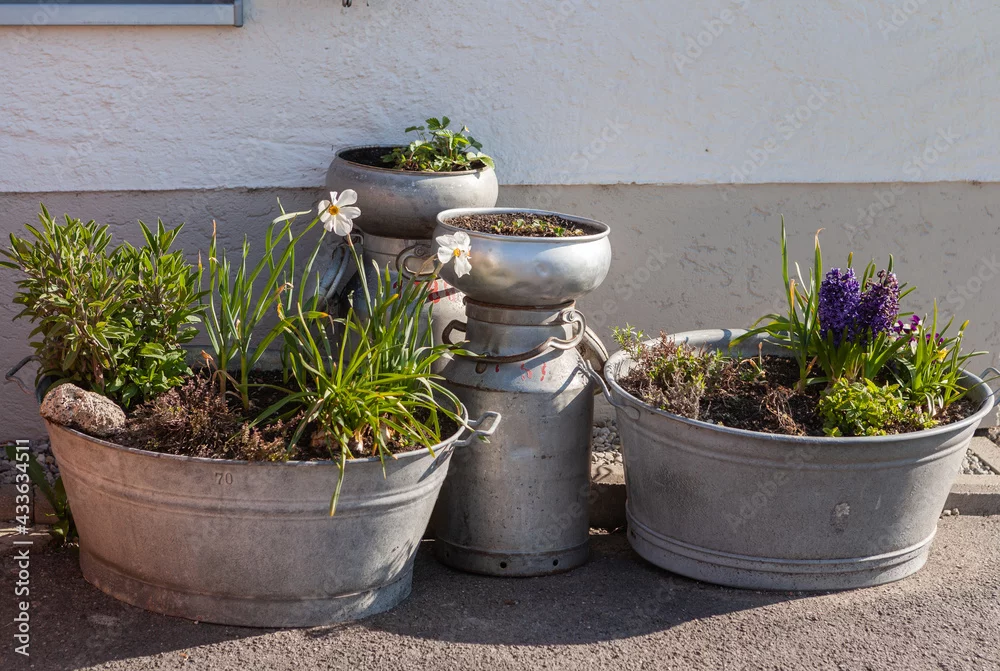 Alte Badewanne aus Blech und Milchkübel als Blumentöpfe