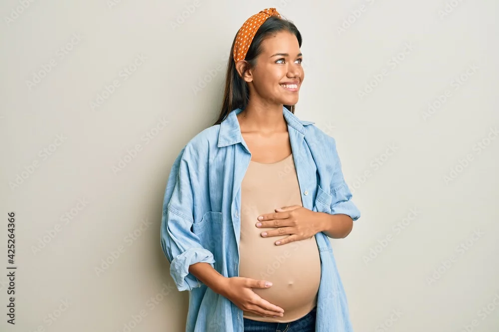 Beautiful hispanic woman expecting a baby, touching pregnant belly looking away to side with smile on face, natural expression. laughing confident.