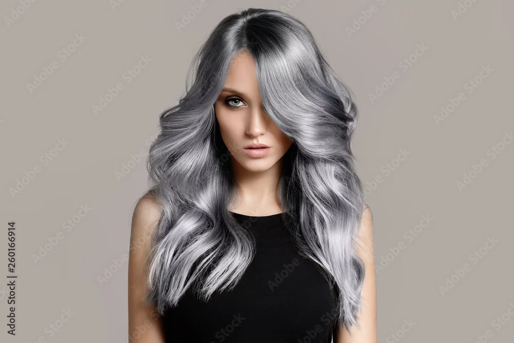 Beautiful woman with long wavy coloring hair. Flat gray background.