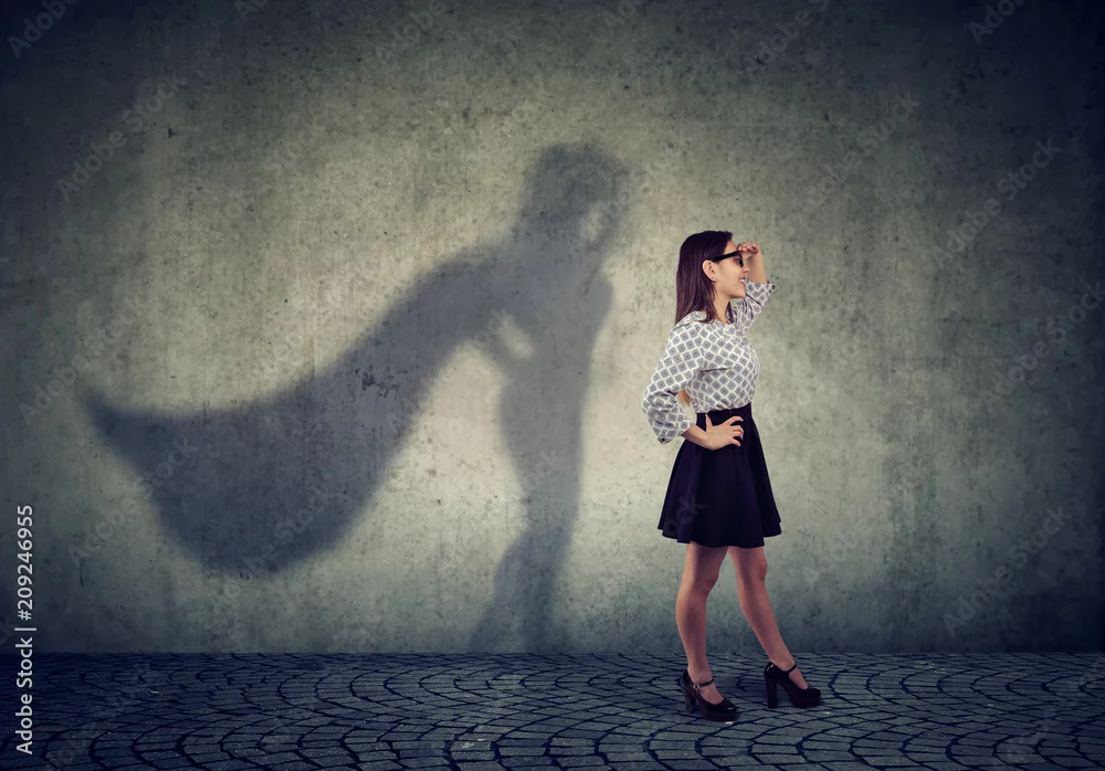 Brave young business woman posing as super hero