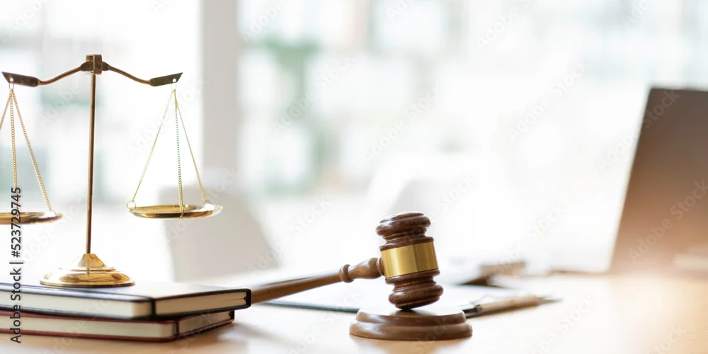 Business and lawyers discussing contract papers with brass scale on desk in office. Law, legal services, advice, justice and law concept picture with film grain effect