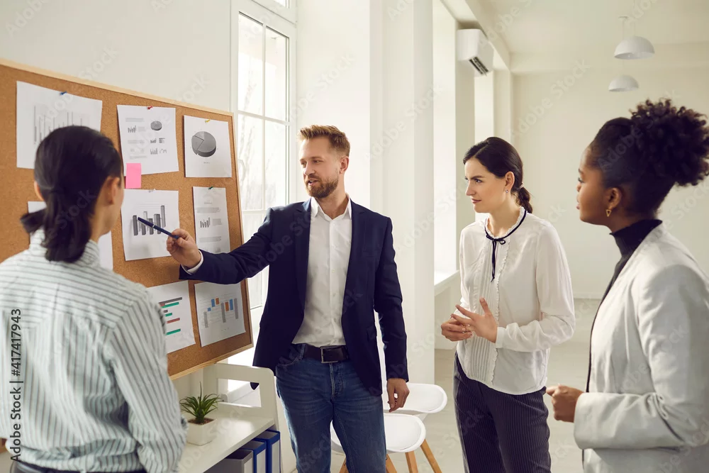 Business team analyzes sales graphs and charts, develops a new strategy, discussing work issues. Young project manager makes a suggestion or points out a mistake at the meeting. Concept of teamwork.