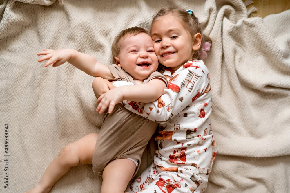 cheerful sister and younger brother hugging each other and lying on a blanket, laughing children, lifestyle