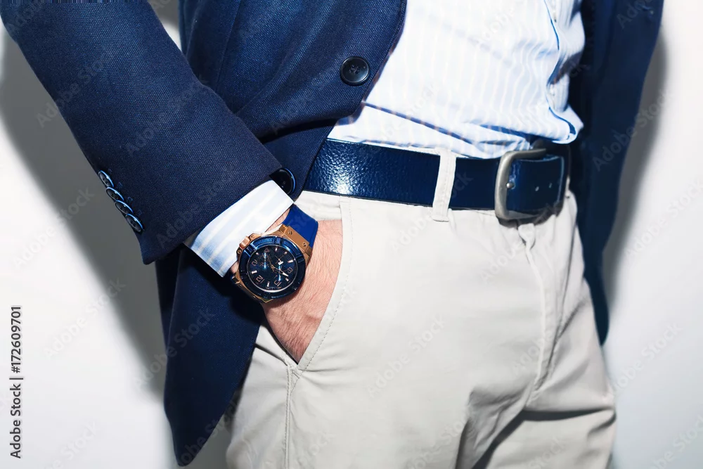 Closeup fashion image of luxury watch on wrist of man.body detail of a business man.Man's hand in a white shirt,blue jacket in a pants pocket closeup. Tonal correction.Man posing in blue suit.