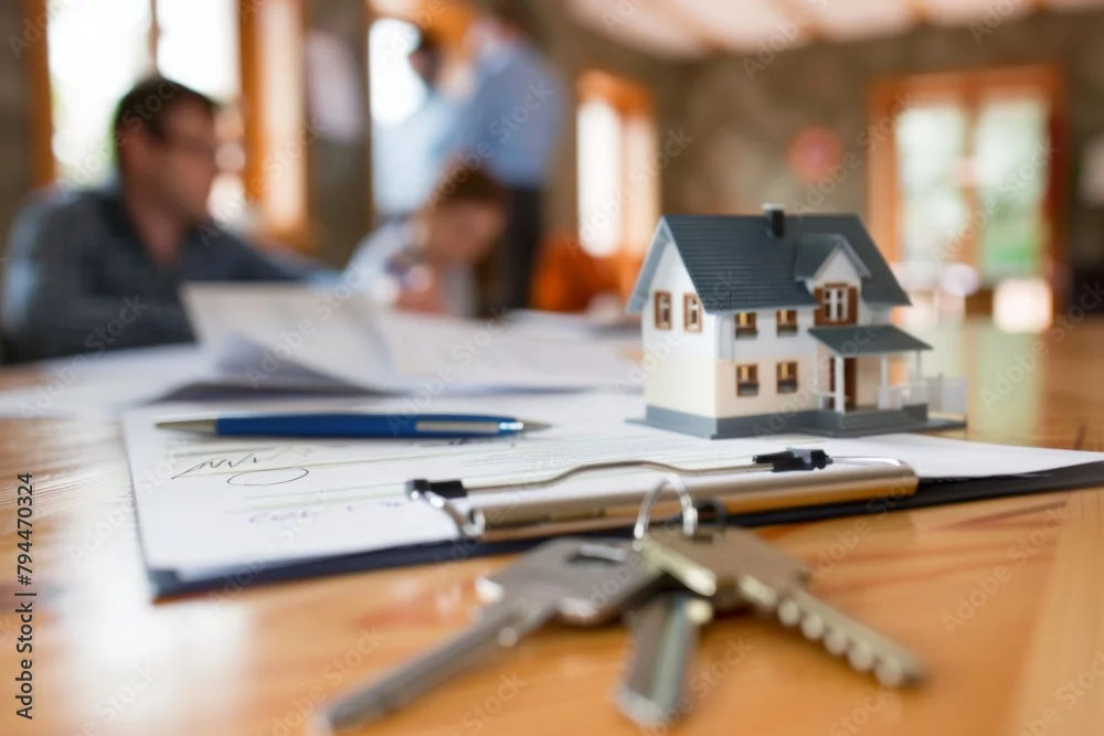 Concept for selling a house and home insurance. Signing a house purchase and sale agreement, housing rental, property insurance. key, house, mortgage, ...