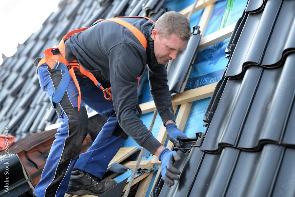 Dachdecker Arbeiter auf Dachlatten stehend am Gurt beim Hausbau auf einer Immobilie, Reparatur und Dachdecker Arbeiten auf Baustellen mit erhöhter Arbeitssicherheit durch persönliche Schutzausrüstung