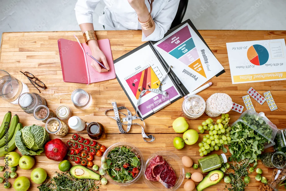 Dietitian writing diet plan, view from above on the table with different healthy products and drawings on the topic of healthy eating