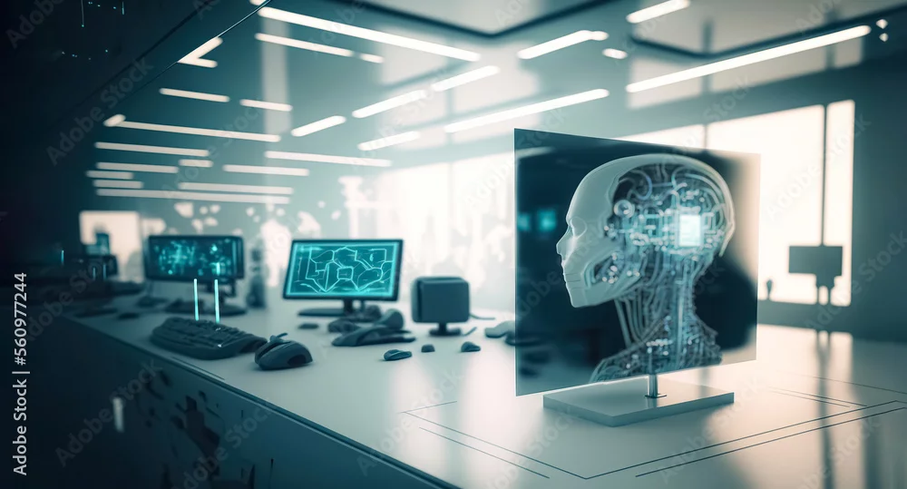 Digital technology high tech background. Modern furnished blurred office interior background with digital hologram, technological schemes. Science and ...