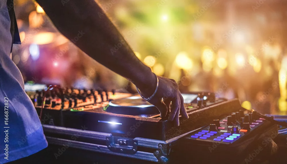 Dj mixing outdoor at beach party festival with crowd of people in background - Summer nightlife view of disco club outside - Soft focus on hand - Fun ,youth,entertainment and fest concept