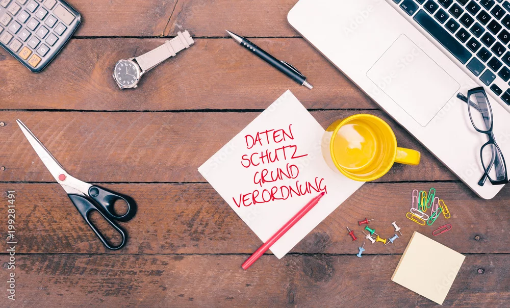 DSGVO written on note, office desk flat lay