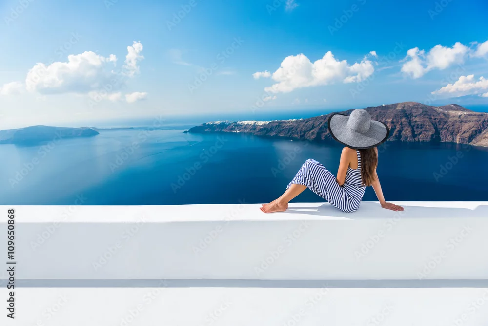 Europe Greece Santorini travel vacation. Woman looking at view on famous travel destination. Elegant young lady living fancy jetset lifestyle wearing dress ...