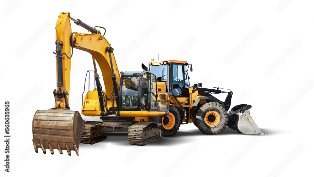 Excavator and bulldozer loader close-up on a white isolated background.Construction equipment for earthworks. element for design.