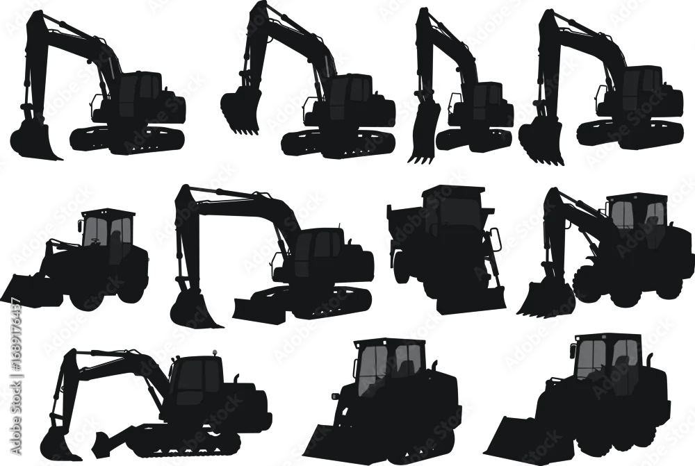 Excavator, bulldozer, backhoe, loader, crawler digger, heavy equipment, construction machinery silhouettes, industrial vehicles, earthmoving tools, black ...