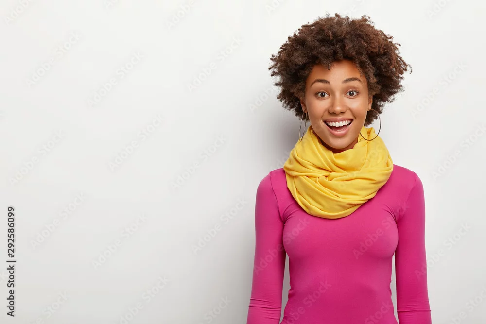 Friendly looking cheerful Afro girl dressed in bright fashionable clothes, smiles broadly, looks straightly at camera, stands against white background, copy space for your promo. Emotions concept