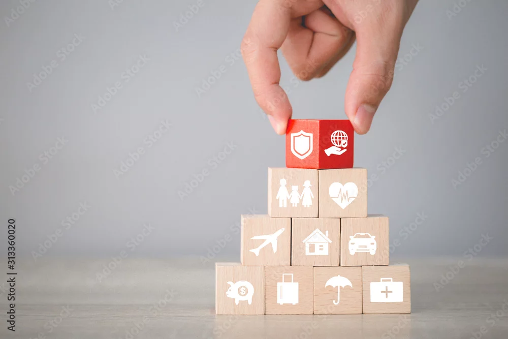 Hand arranging flips wood block stacking with icon insurance: car, real estate and property, travel, finances, health, family and life, insurance concept.