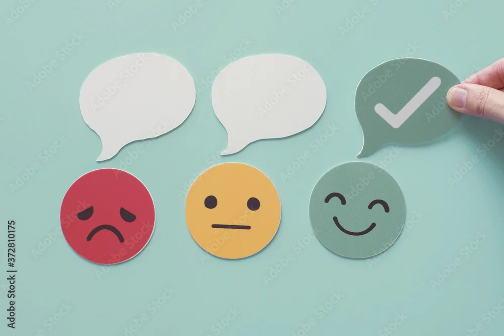 Hand choosing green tick paper cut, feedback rating and positive customer review, experience, satisfaction survey ,mental health assessment concept