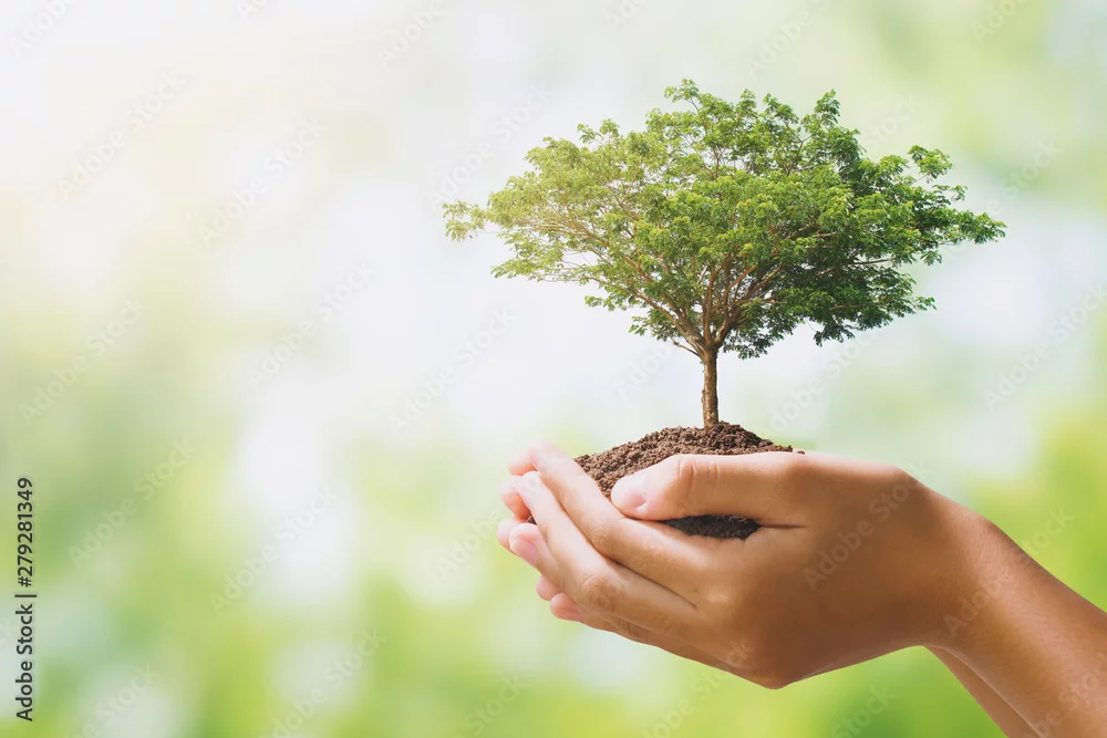 hand holdig big tree growing on green background. eco earth day concept