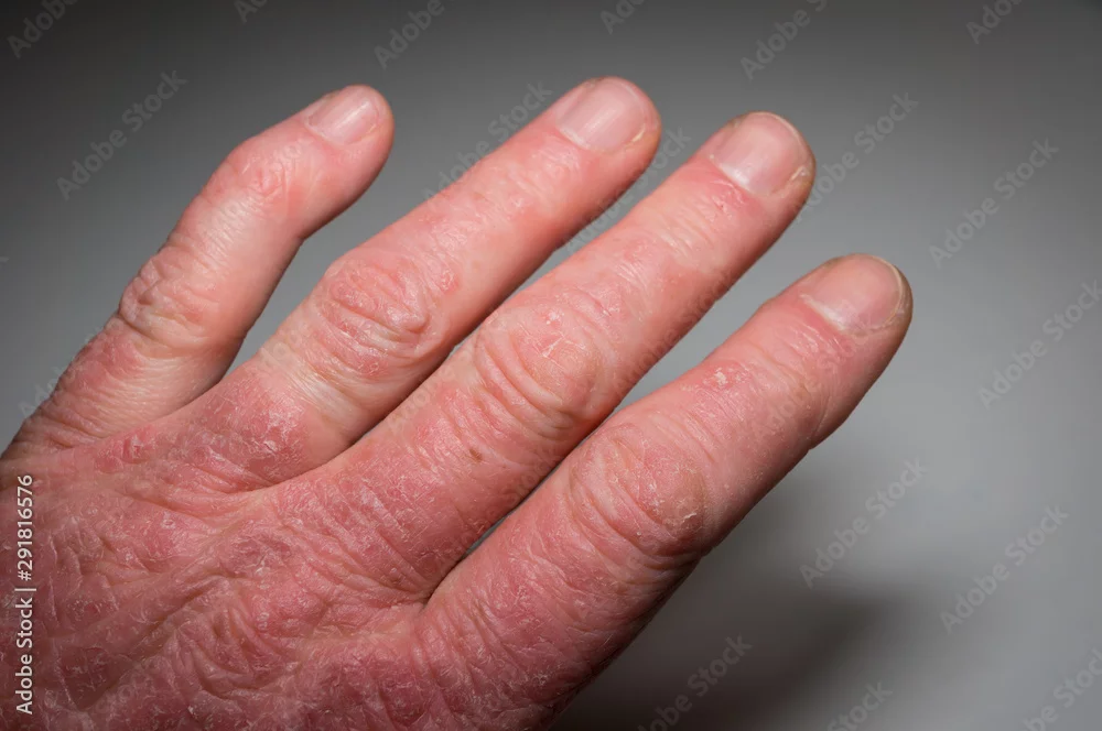 Hand of a psoriasis patient close-up. Psoriatic arthritis. Joint deformation and inflammation on the skin. Photo with dark vignetting. Soft focus