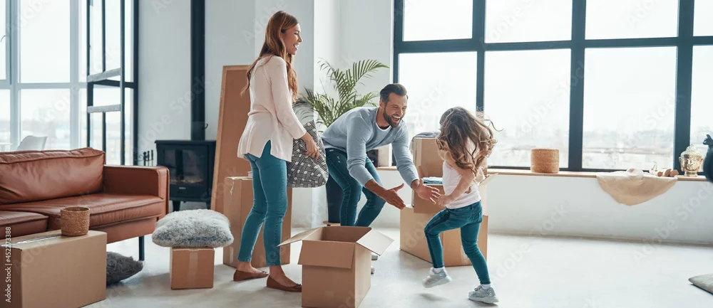 Happy young family smiling and unboxing their stuff while moving into a new apartment