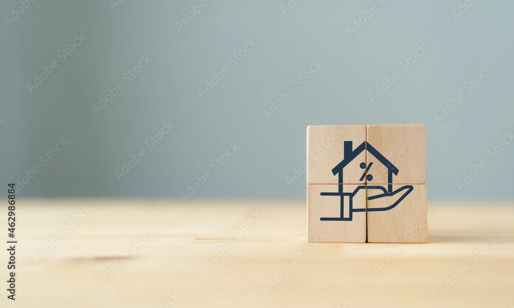 Home loan, mortgage and buy a real estate concept. The wooden cube with icon of hands holding house model in grey background and copy space. Banner for home buying, loan and insurance