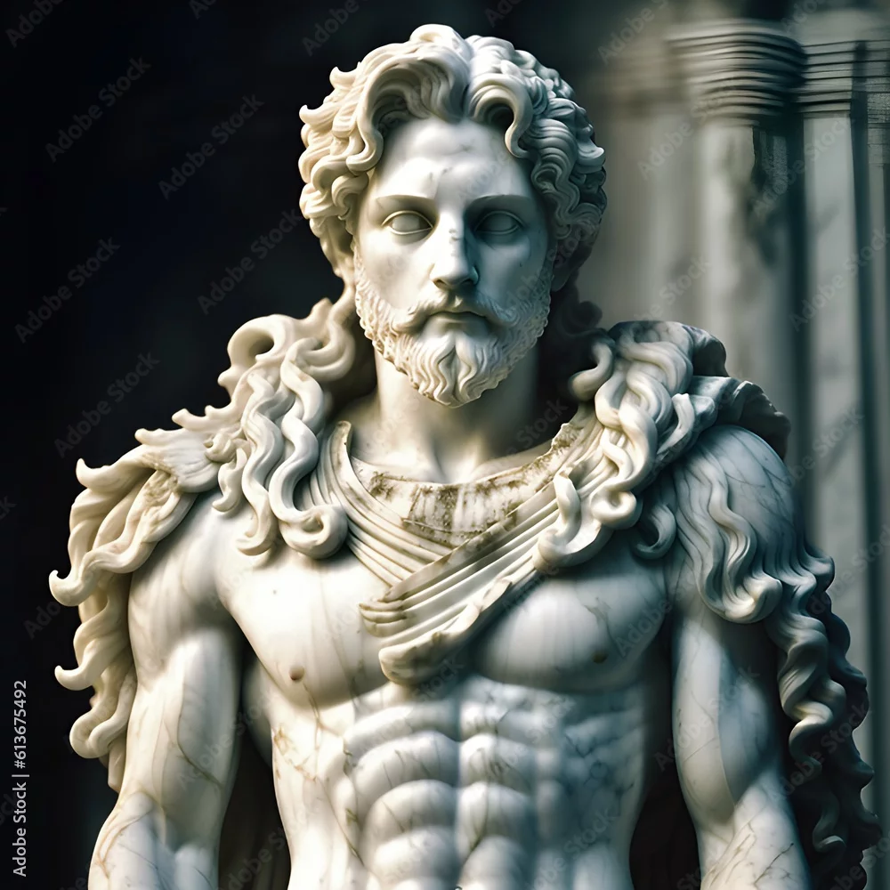 Image featuring a chiseled white marble statue bust of Greek god Zeus also known as the Roman god Jupiter, god of thunder and the king of gods on Mount Olympus in ancient Greek Mythology