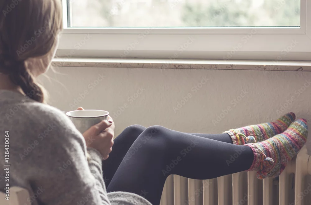 Junge Frau schaut aus dem Fenster, trinkt Tee und legt Füße zum Aufwärmen auf die Heizung.
