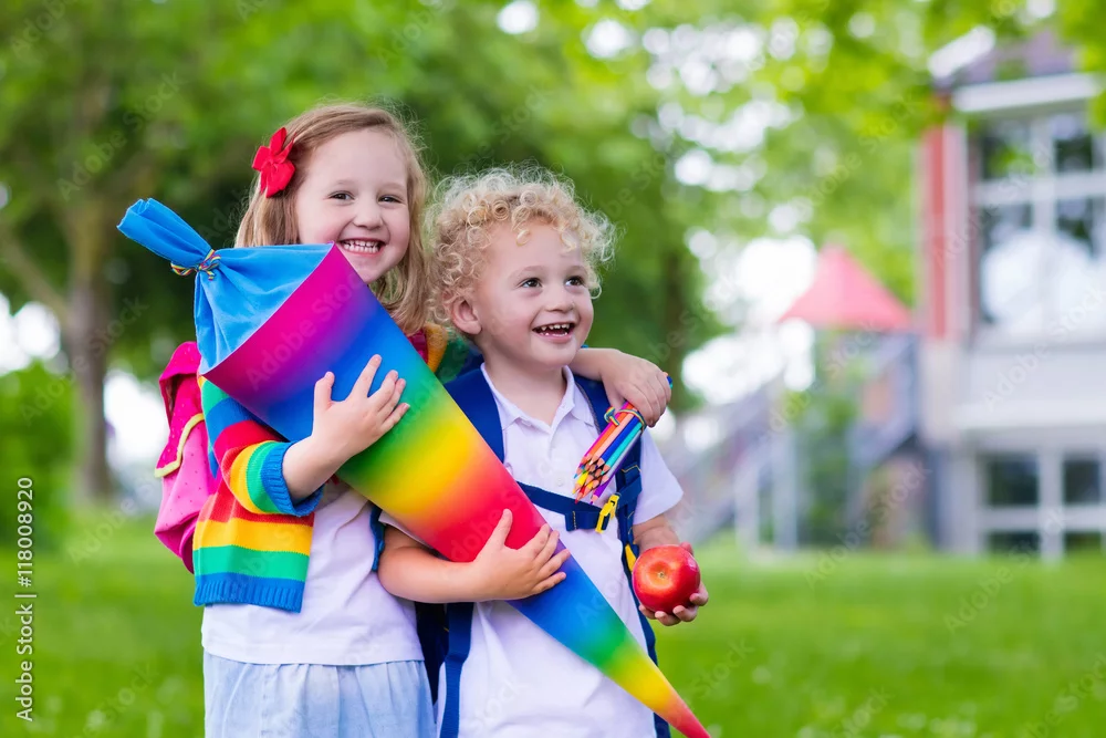 Kids with candy cone on first school day in Germany