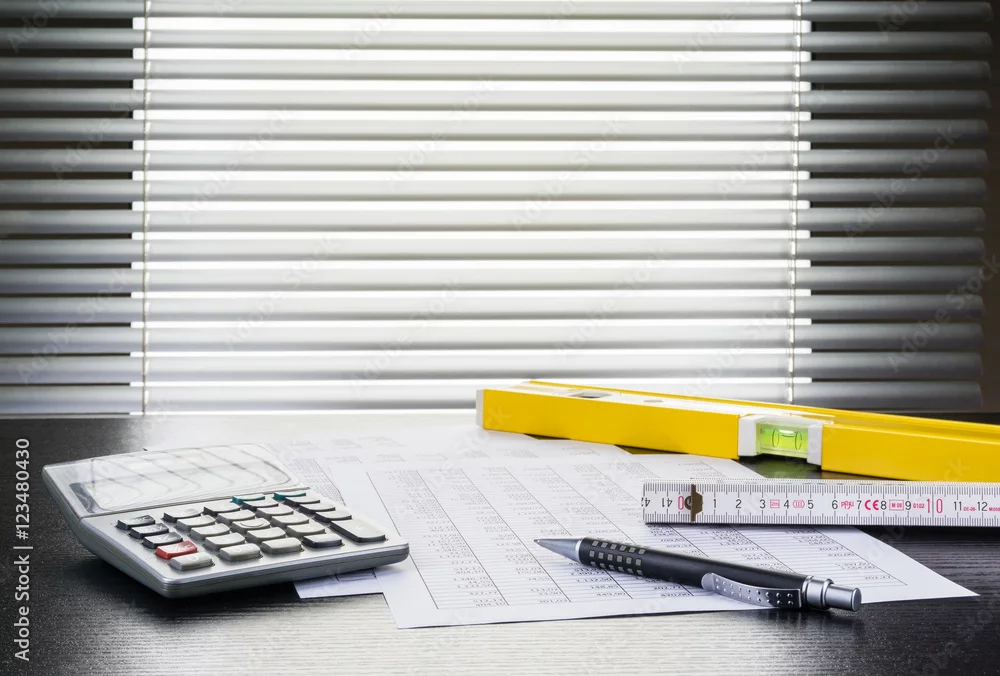 Kugelschreiber, Tabellen, Taschenrechner, Zollstock und Wasserwaage auf Schreibtisch vor Fenster mit Jalousie