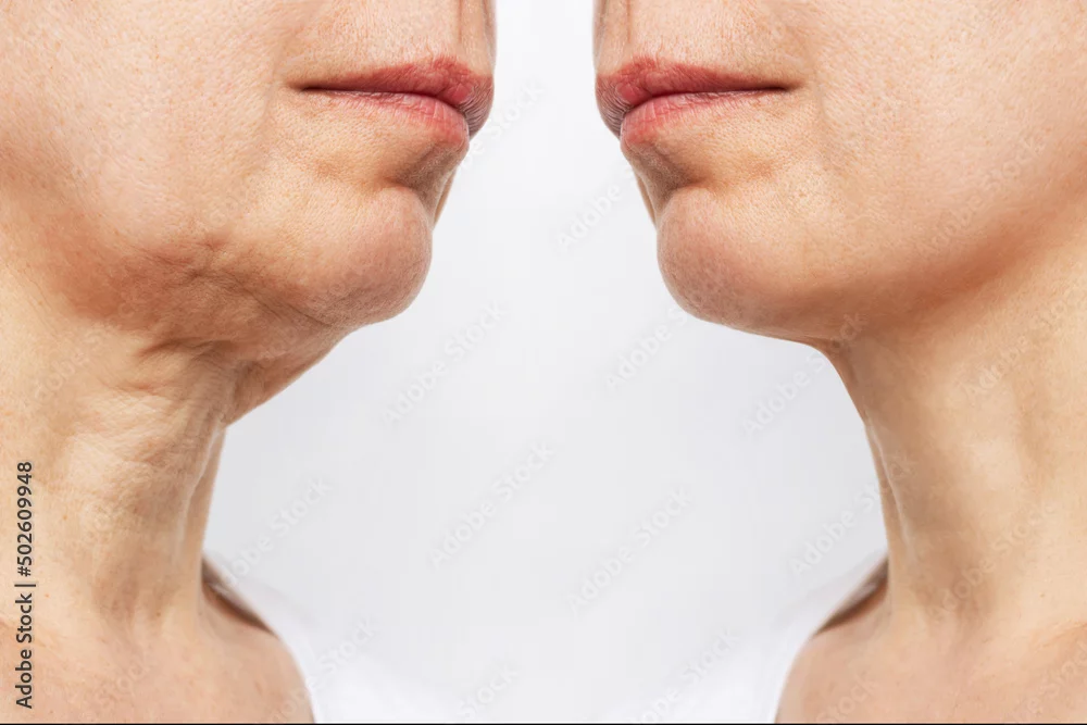 Lower part of face and neck of elderly woman with signs of skin aging before and after facelift, plastic surgery isolated on white background. Age-related changes, flabby sagging skin. Platysmoplasty