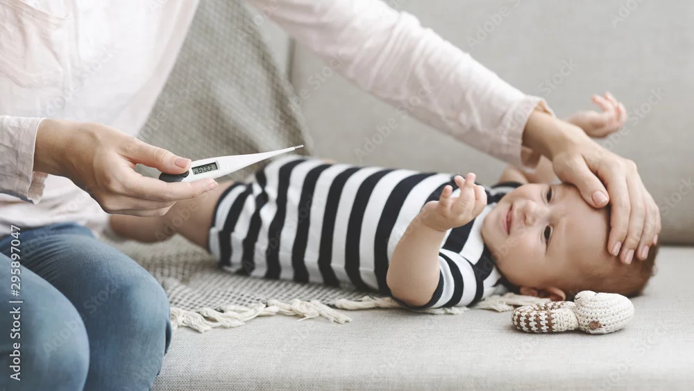 Mother holding thermometer measuring temperature of her sick baby