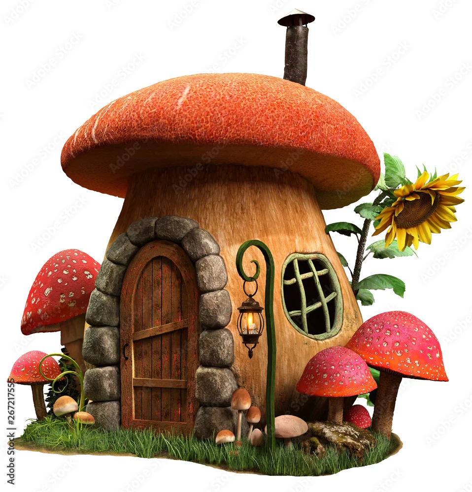 Mushroom house and sunflower 3D illustration