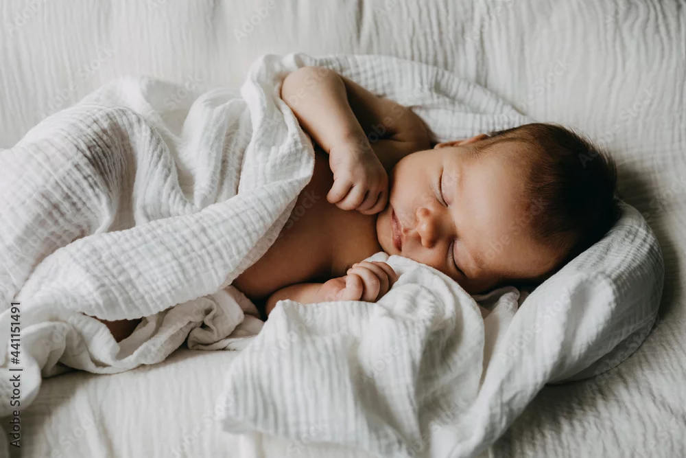 Newborn baby sleeping in a baby nest, covered with white muslin blanket.