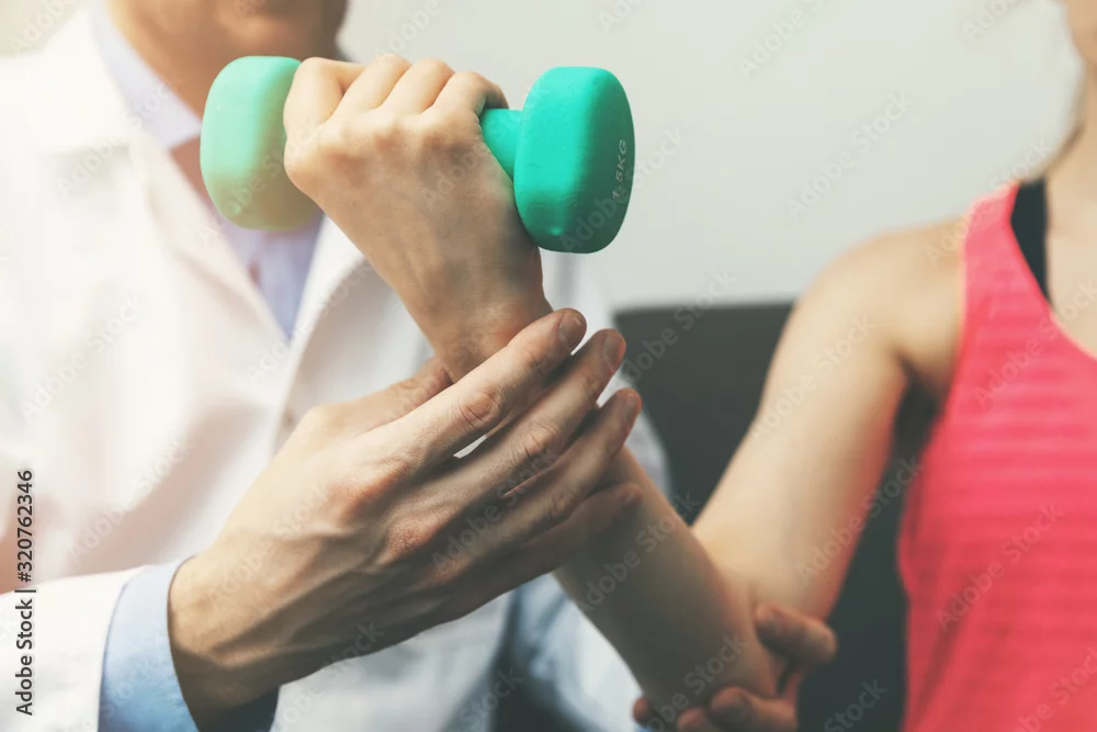 physiotherapy - physiotherapist help woman patient to recover from hand injury at home. dumbbell exercises