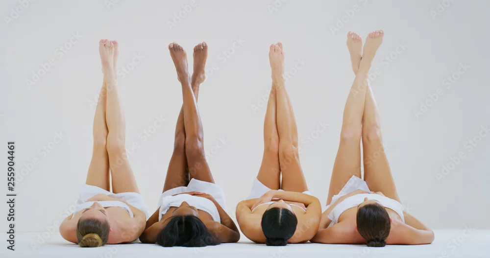 Portrait of beautiful young women of different ethnicities with perfect firm and slim bodies with hairless soft and silky legs crossed isolated on a white background.
