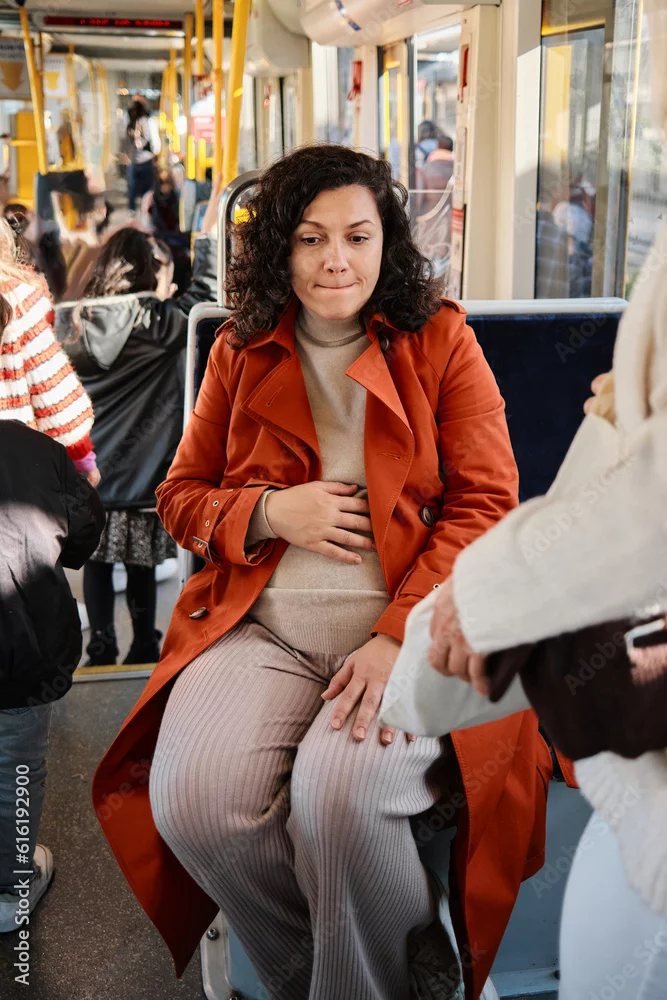 Pregnant woman in orange coat, curly hair riding city public transportation