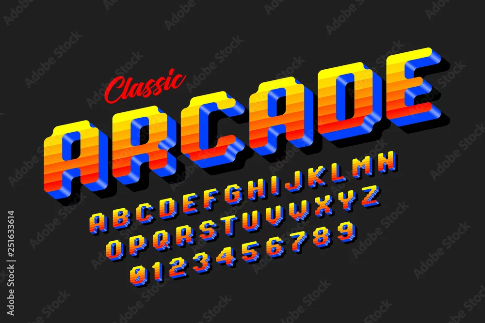 Retro style arcade games font, 80s video game alphabet letters and numbers